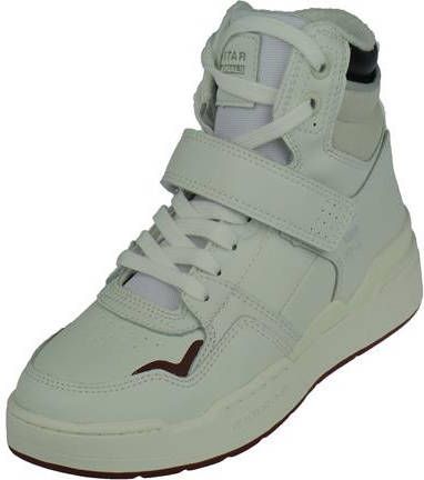 Dit model is uitgevoerd in een wit leer met subtiele zwart en rode accenten. De padded schacht is zacht gevoerd voor extra comfort en op de tong is een opvallende logo applicatie geplaatst. Verder zijn deze trendy hoge sneakers voorzien van een veter en klittenbandsluiting.